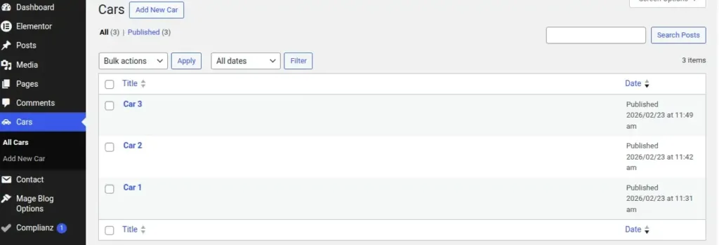 add_shortcode('cars_list', 'display_cars_frontend');Step 6: Use shortcode