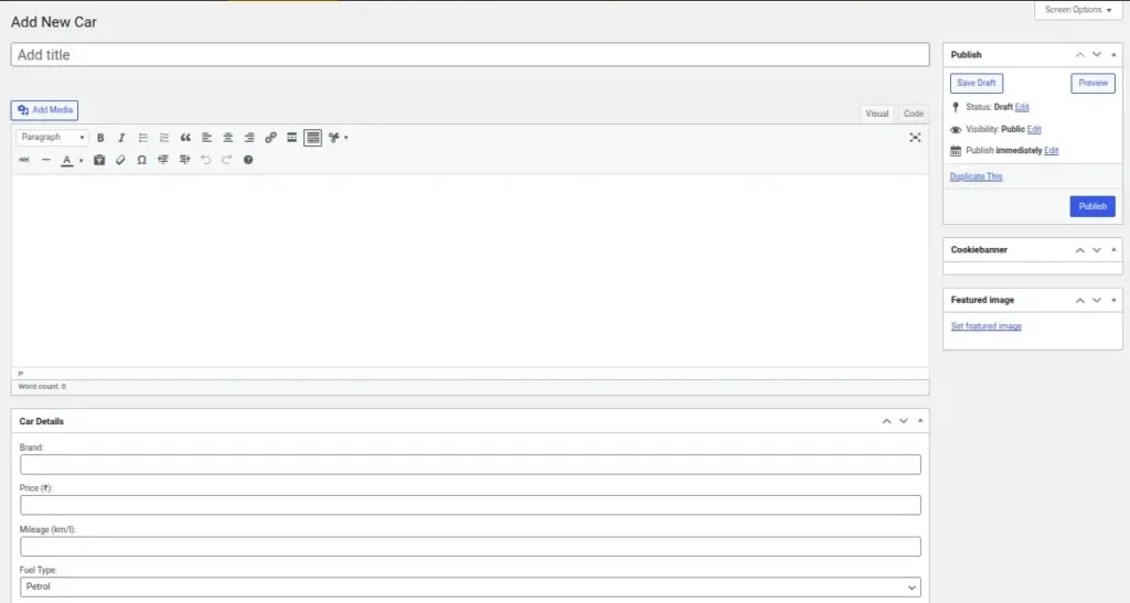 - ‘Car Details’ – Title to be displayed in the WordPress admin