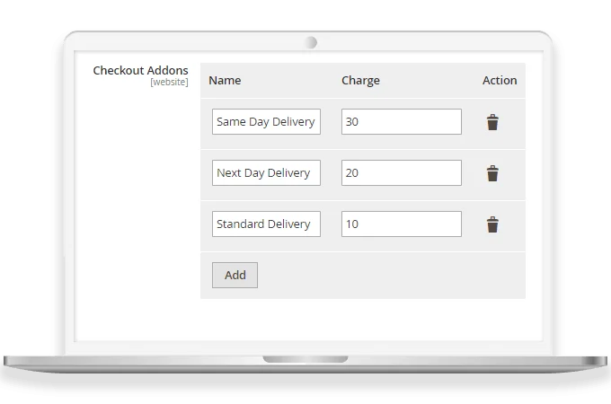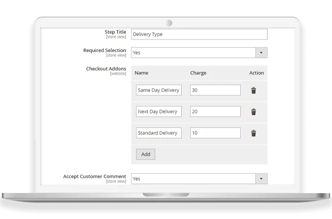 From the backend, the admin can manage the add-on services. The admin can set the customized title of the checkout step, tab name, and options for add-ons.