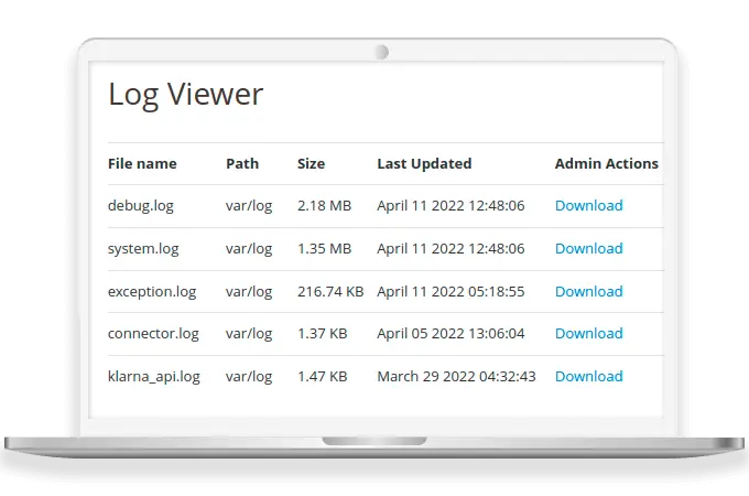 Magento 2 Log Download Extension allows the admin to view all the logs from the backend grid and efficiently download from there itself. Admin just needs to enable the extension from the backend and it will add a log viewer option in the system configuration menu. The view logs option will display all the logs in a grid form with the required details. The log viewer grid also has a Download option for each log.