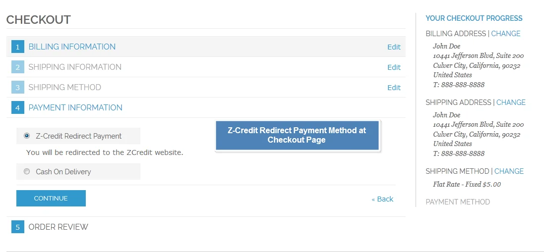 This method will help your customer to choose Z-Credit payment method on checkout page. Once selected and clicked on place order they will be redirected to Z-Credit website for the further transaction. IF all go well with the transaction (if captured successful) user will be redirected to merchant website with order success page. Extension will send all the order information with secure tunnel to the payment gateway for the further transaction.
